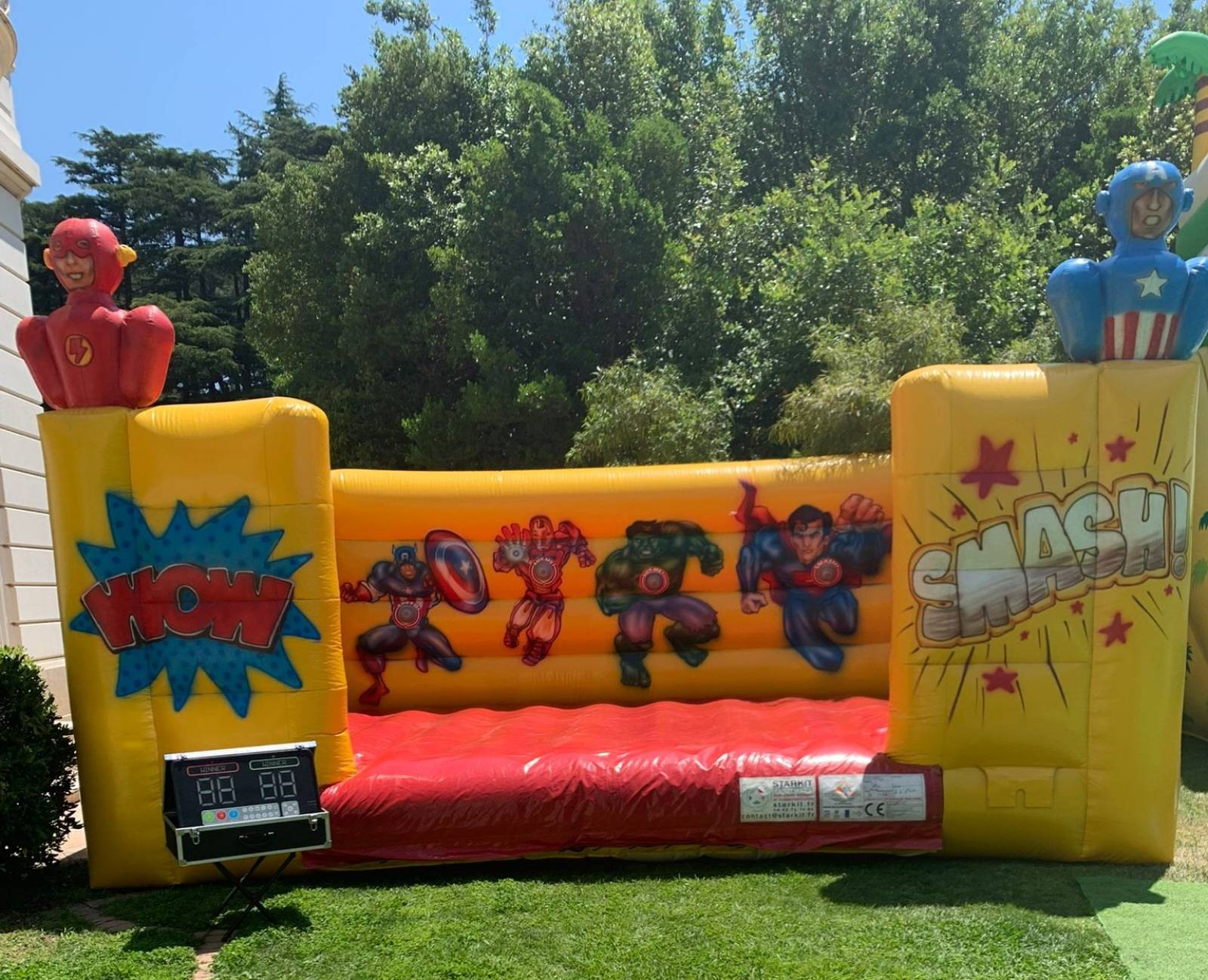 Plongez dans l'action avec le Smash Challenge Super Héros, une structure gonflable pleine d'énergie proposée à la location par Starkit Événements pour vos anniversaires, fêtes de CSE, et événements municipaux à Aubagne, Nice et Monaco. Cette animation interactive invite les participants à se lancer dans une aventure captivante où rapidité et esprit d'équipe sont les clés de la victoire.
