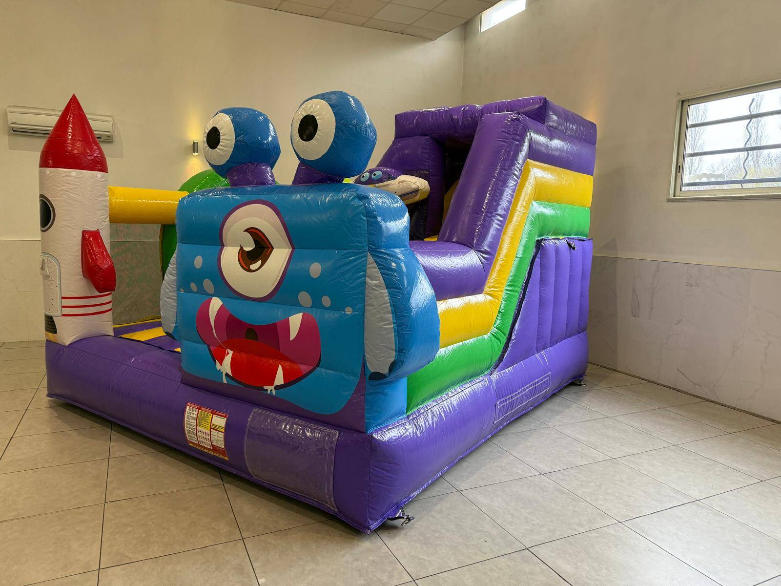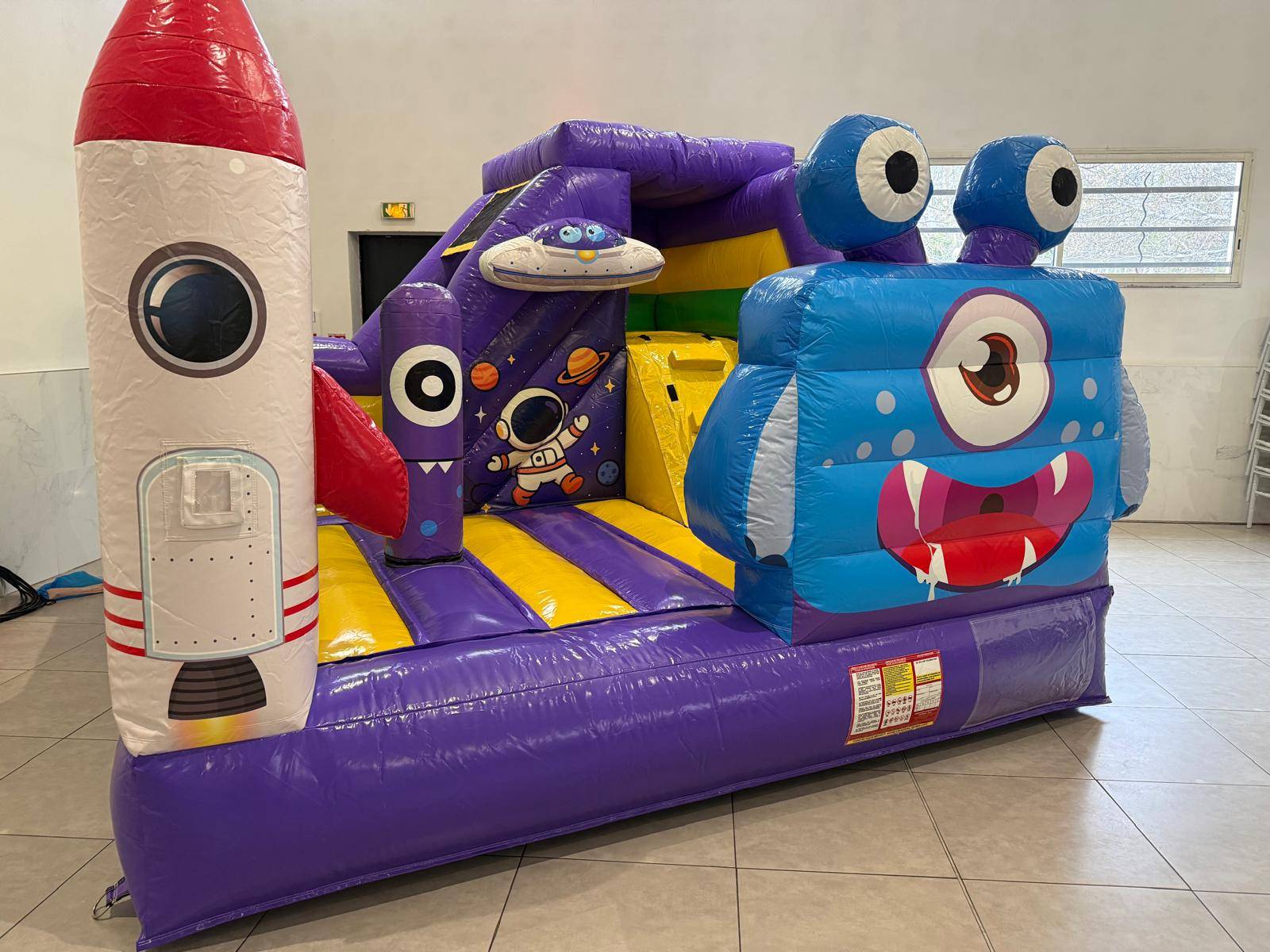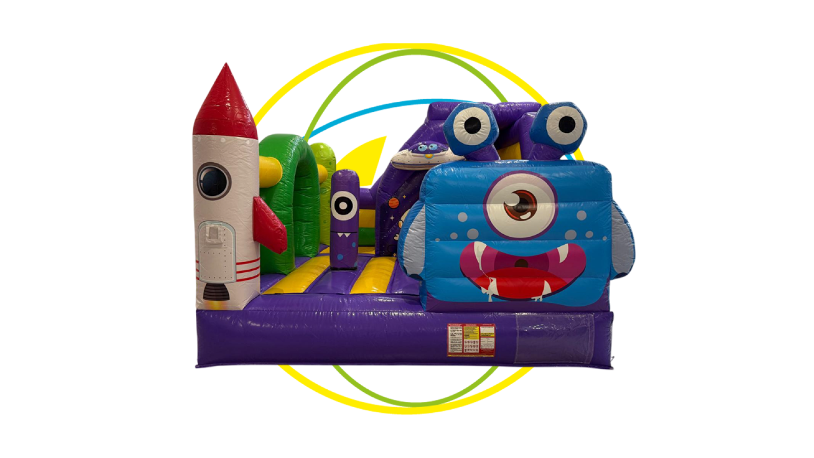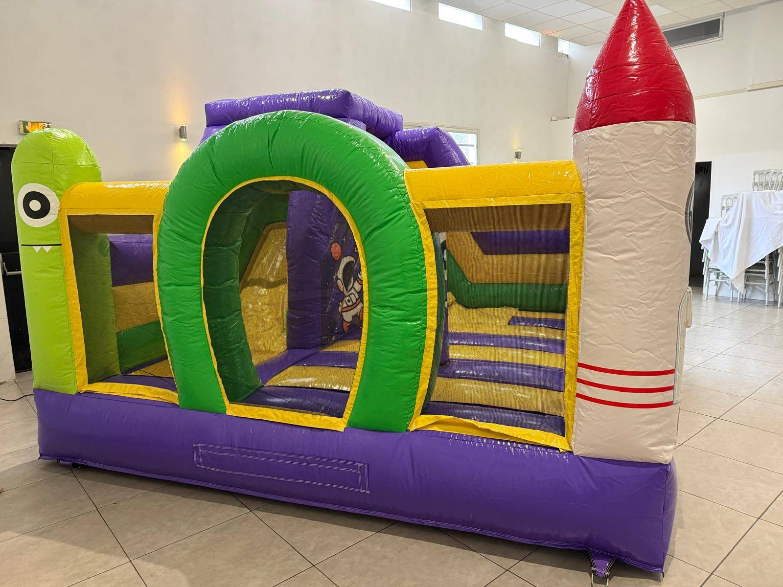 Le château gonflable COMBO ESPACE se distingue par son design coloré et son thème intergalactique qui attire immédiatement l’attention des enfants. Sur la façade, un personnage amusant à l’allure de petit extraterrestre accueille les participants, tandis qu’une fusée gonflable placée sur le côté renforce l’ambiance spatiale.