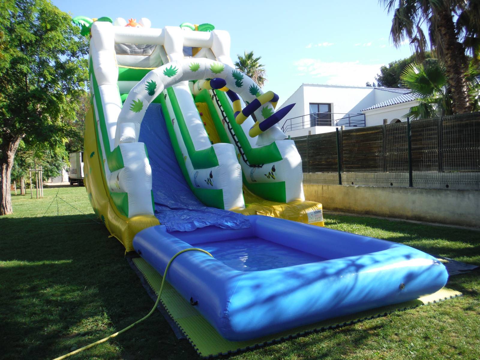 Bénéficiez d'une installation rapide et sécurisée de notre toboggan gonflable aquatique, où que vous soyez en région Sud. Nous offrons une solution clé en main pour que votre événement se déroule sans le moindre accroc, avec la possibilité d'installer un bassin de réception ou de positionner le toboggan au bord d'une piscine.
